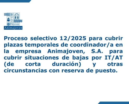 Sonia2025-11-14 12:13:482025-12-04 09:57:43Proceso selectivo 12/2025 para cubrir plazas temporales de coordinador/a en la empresa Animajoven, S.A. para cubrir situaciones de bajas por IT/AT y otras circunstancias.