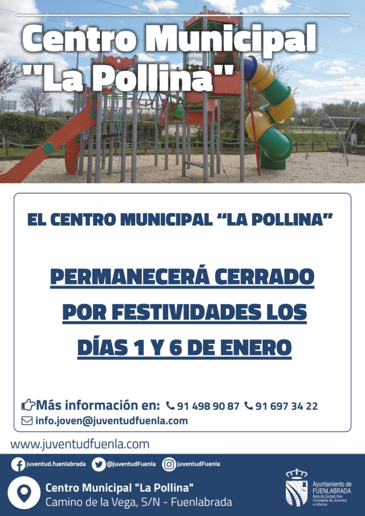 Sonia2025-12-15 09:52:072025-12-15 09:52:07ℹ️ El Centro Municipal “La Pollina” permanecerá cerrado por festividades los días 24, 25, 26, 30 y 31 de diciembre de 2025